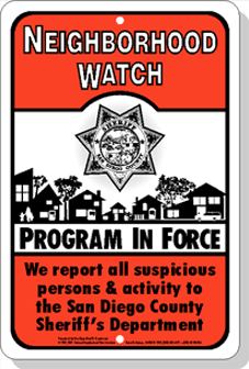 Most customized signs are a two-color variant of NNWI’s generic signs designs and are the same price as the generic signs when your agency orders 30 or more signs. If less than 30 signs are ordered, then there is an additional $150 customization fee plus the cost of the same number of two-color generic signs, plus UPS and if in California, applicable sales tax. For example, assume you want less than 30 customized 18”x24” signs: If you order 1 to 29 customized 18”x24” signs the price would be $150 customization fee PLUS: if the quantity is 1 to 3 signs, $43.40/sign; if the quantity is 4 to 14 signs, $42.40/sign; if the quantity is 15 to 29 signs, $41.15/sign. Shipping via UPS or other carrier is additional, and if you reside within California, your area’s sales tax rate will be applied. The above pricing is based on NNWI’s 2-color sign designs: Black and Warm Red; Black and Blue; or Black and Yellow. Full-color signs must be quoted. There is one exception to the 30 signs minimum. That is for the 36” x 24” 2-color Community Signs which has a 5-sign minimum quantity. When you order this is what to expect. Upon receipt of your order, NNWI will obtain the exact wording you would like used on your custom Neighborhood Watch sign. Next, NNWI will send you a PDF PROOF of the custom Neighborhood Watch sign artwork. This allows you to review the design. At this point, you either approve the PDF PROOF of the custom Neighborhood Watch sign artwork or request a further change. Once the custom Neighborhood Watch sign artwork is approved, your custom Neighborhood Watch signs will go into production and cannot be changed. Upon completion, your custom Neighborhood Watch sign will be sent to you at the ship to address you provide. All customized decals must be quoted on a case by case basis. Call NNWI at 888-669-4872 with any questions or for assistance.Custom Sign Examples