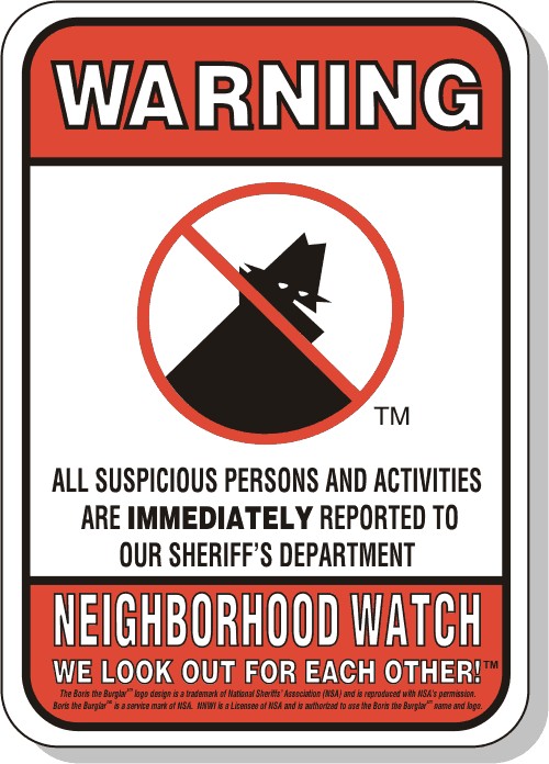 National Neighborhood Watch Institute Reflective Aluminum Warning Sign. Boris the Burglar, Sheriff, 12 x 18 Medium Reflective Aluminum Warning Sign. Premium reflective aluminum construction for maximum nighttime visibility. Suitable for exterior mounting. Sold individually. For agency and municipal procurement.