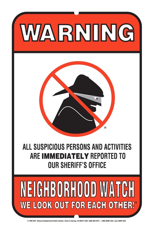 National Neighborhood Watch Institute Reflective Aluminum Warning Sign. Masked Bad Guy, Sheriff Office, 9 x 12 Small Reflective Aluminum Warning Sign. Premium reflective aluminum construction for maximum nighttime visibility. Suitable for exterior mounting. Sold individually. For agency and municipal procurement.